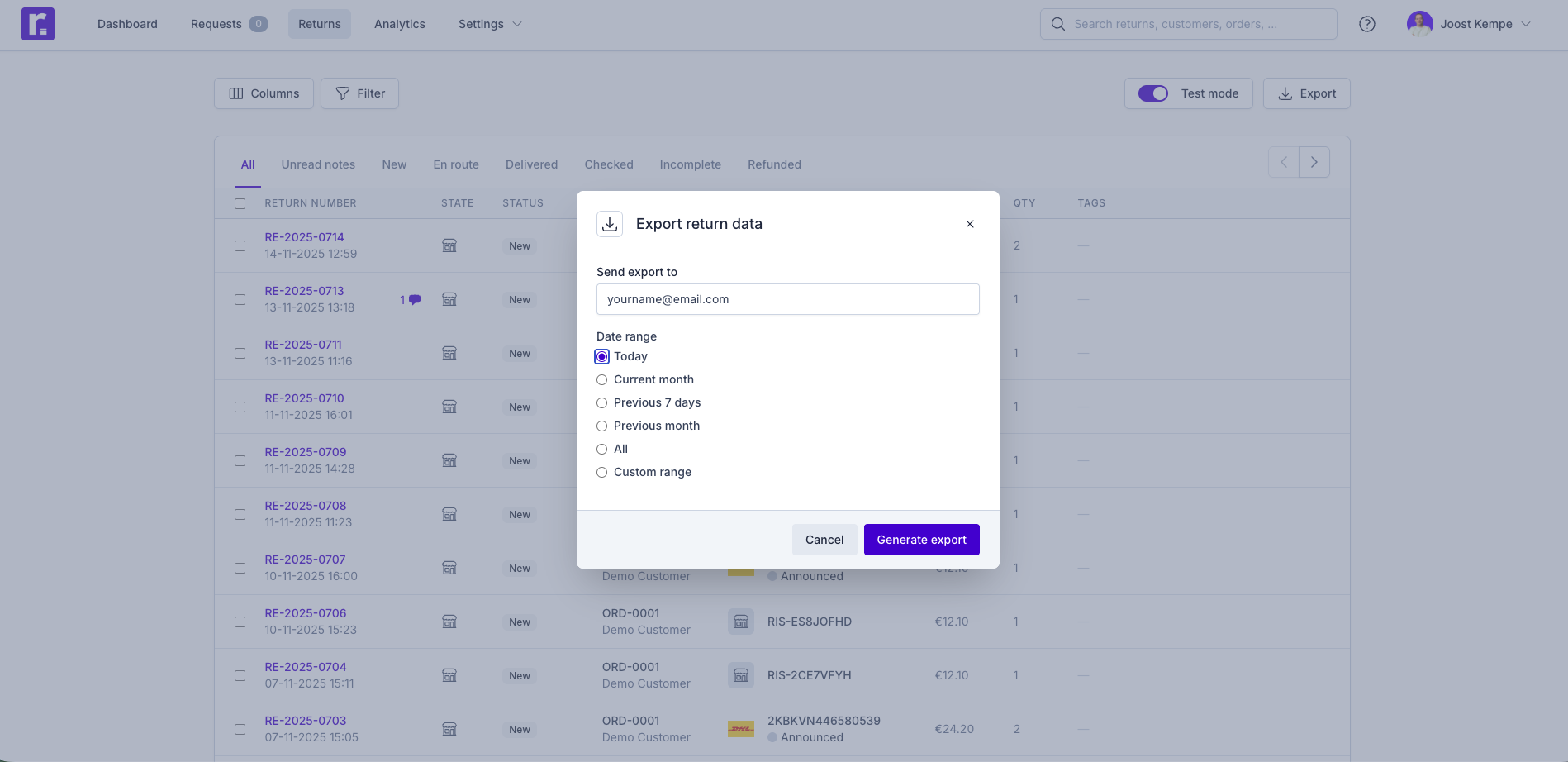 Returnless allows you to export your returns data for reporting, analysis, or import into other systems. You can generate an export directly from the returns overview.