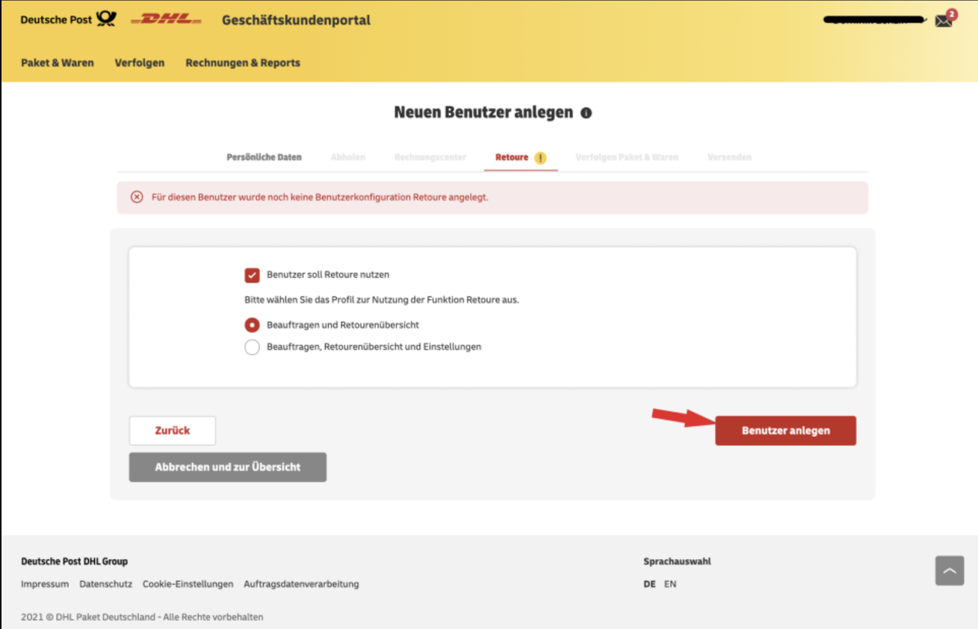 - Go to DHL Geschäftskundenportal > Parcel & Products > Returns > Settings.