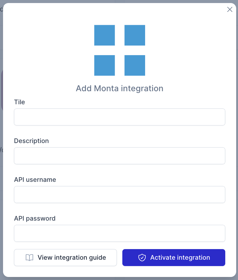 - Select the Monta integration. A modal will open, asking you to enter the API username and password that you've created in the previous step.