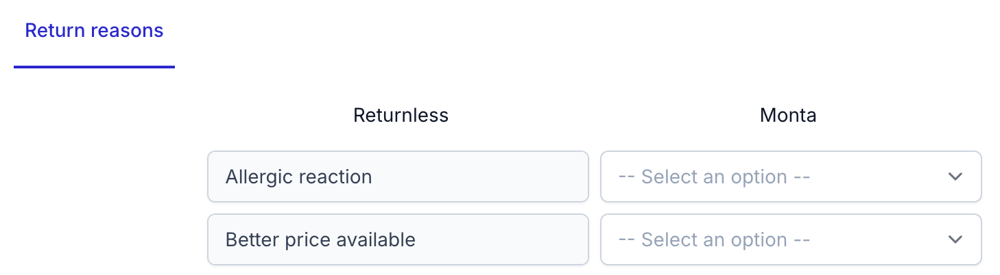 Returnless and Monta both track return reasons for returns. These return reasons are not exactly the same and therefore mapping is needed to link them.