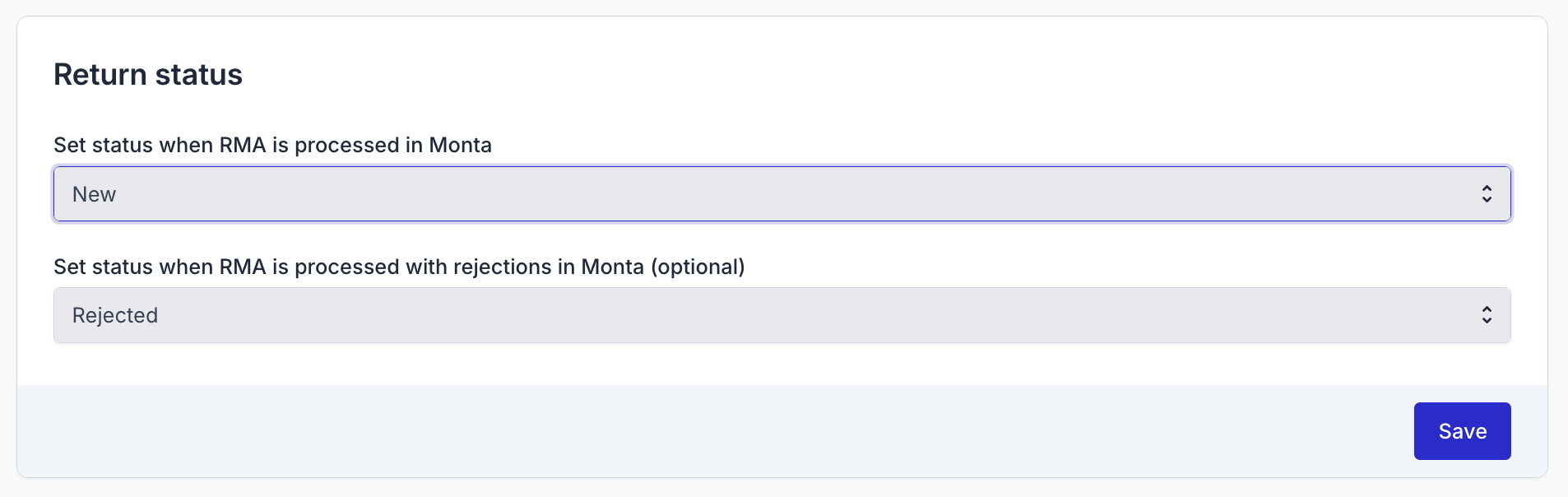 It is possible to define which status in Returnless should be set for the return order when the RMA in Monta has received the status processed.