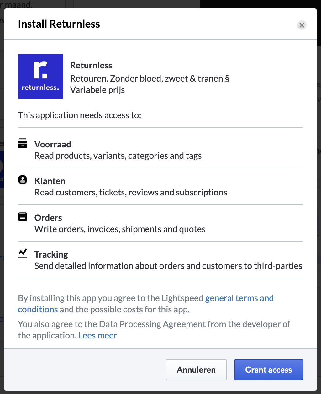 Before adding the integration in Returnless, you must install the Returnless app in the Lightspeed marketplace.