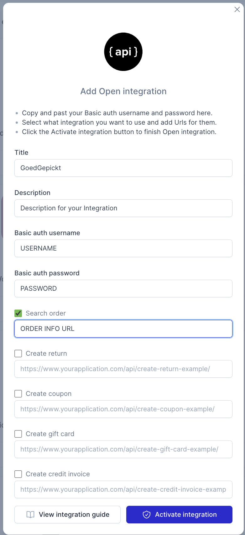 - Webhook Signing Secret: Copy and save this secret in GoedGepickt in the "Returnless webhook signing secret" field, in the Third Party App settings page.