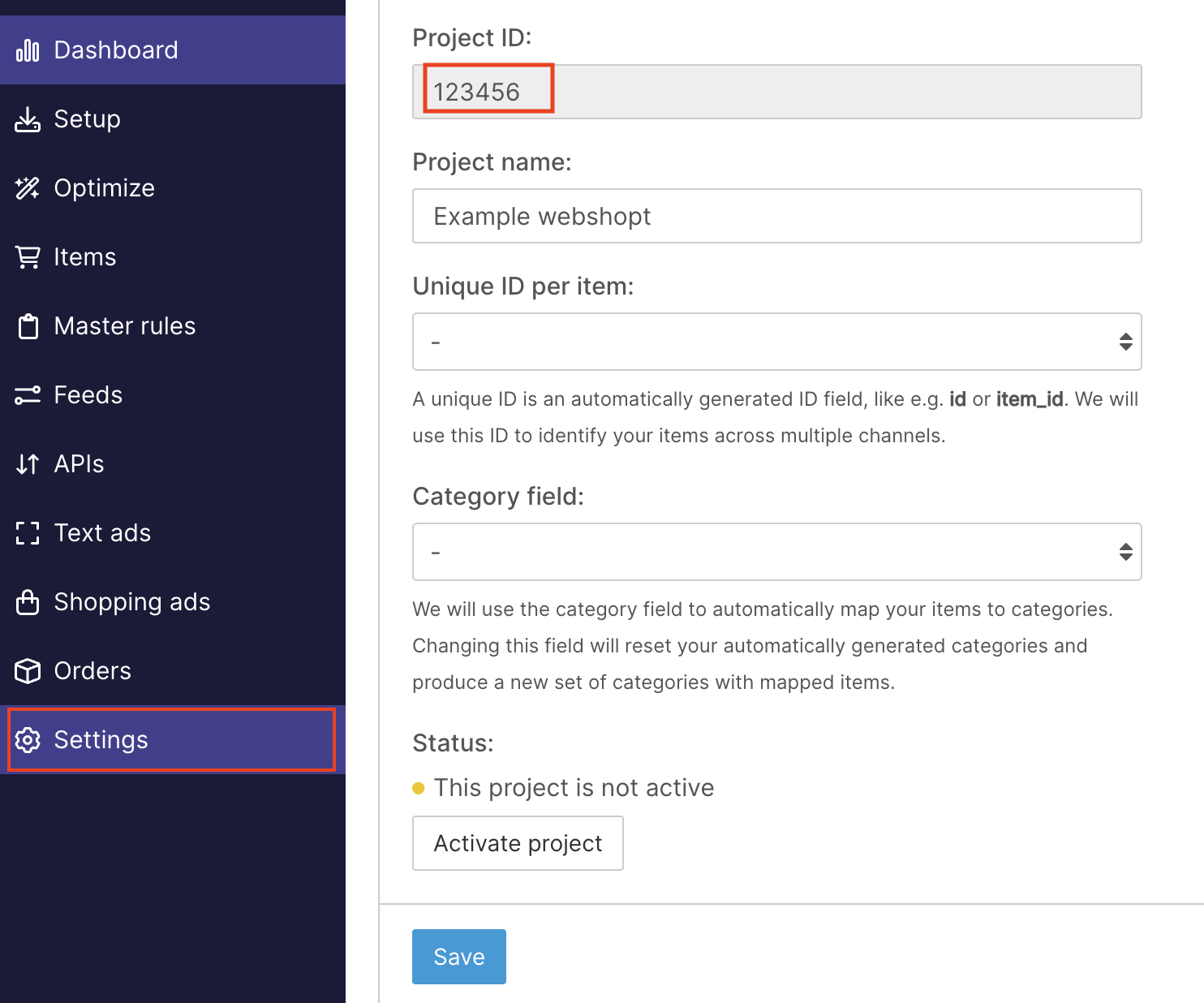 | Project ID | The ID of the project. This can be found by going to project settings in Channable |