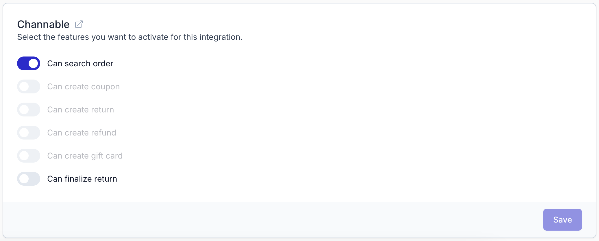 Other features can be toggled in the same overview. Scroll down to the Channable section. Here you will see all available features and whether they are on or off. If you want to enable or disable a feature you can change it here and then click on Save.