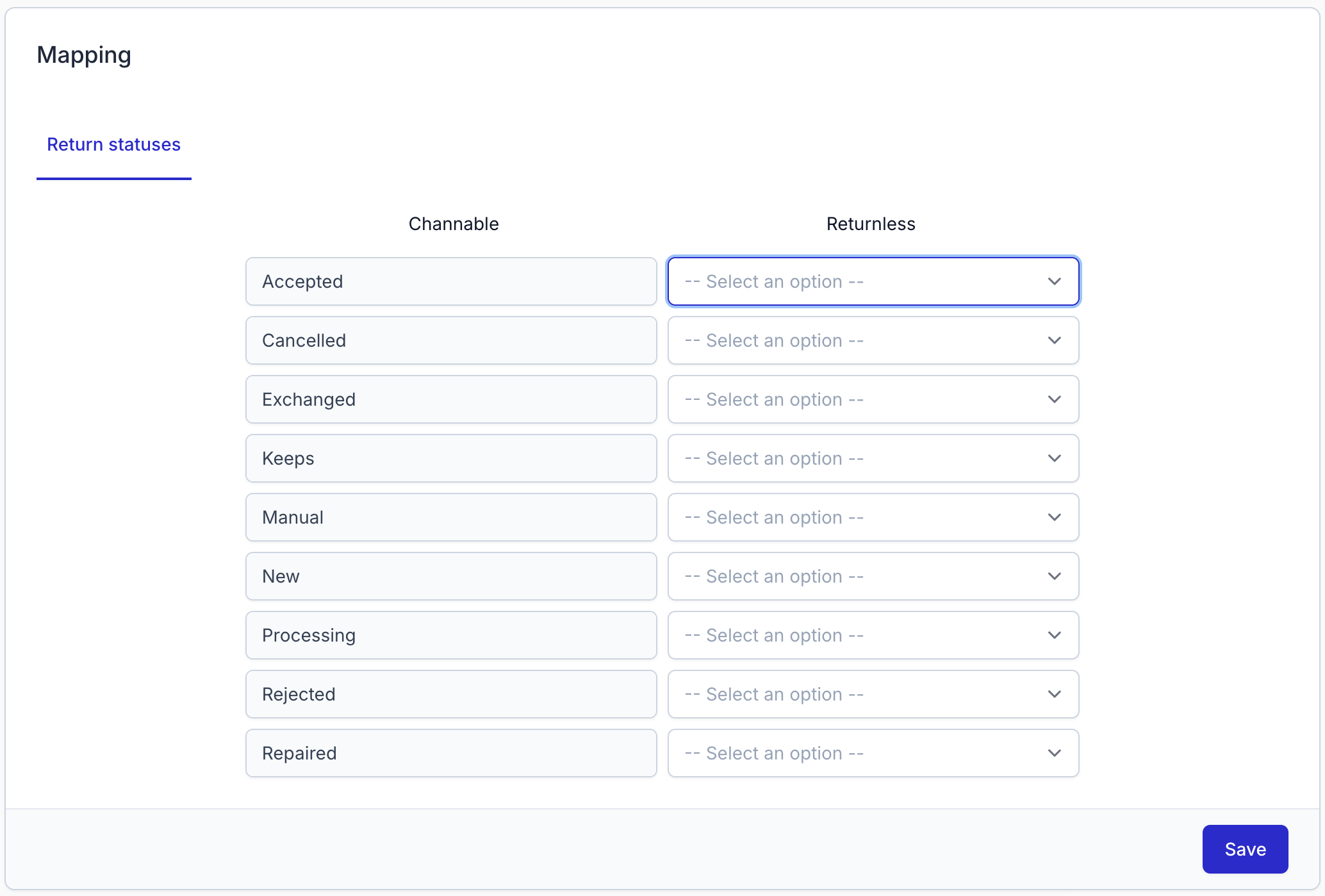 When returns are imported, each return will get a return status which corresponds to the status in Channable. The integration allows Channable return statuses to be mapped to Returnless statuses. When a return is imported, the status will be converted to the selected Returnless status.