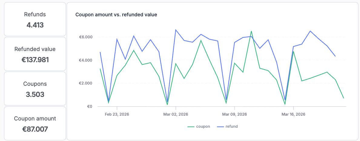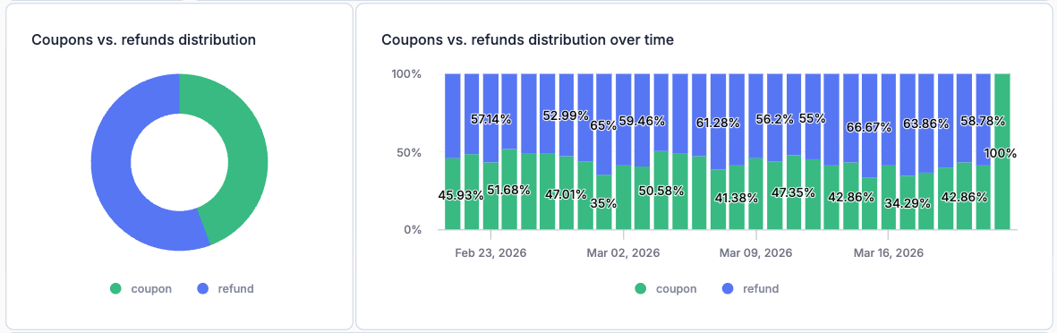 The stacked bar chart shows the percentage breakdown of coupons vs. refunds for each day. This is particularly useful for tracking the success of new return policies or "Bonus Credit" promotions (e.g., offering 110% value if the customer chooses a coupon).