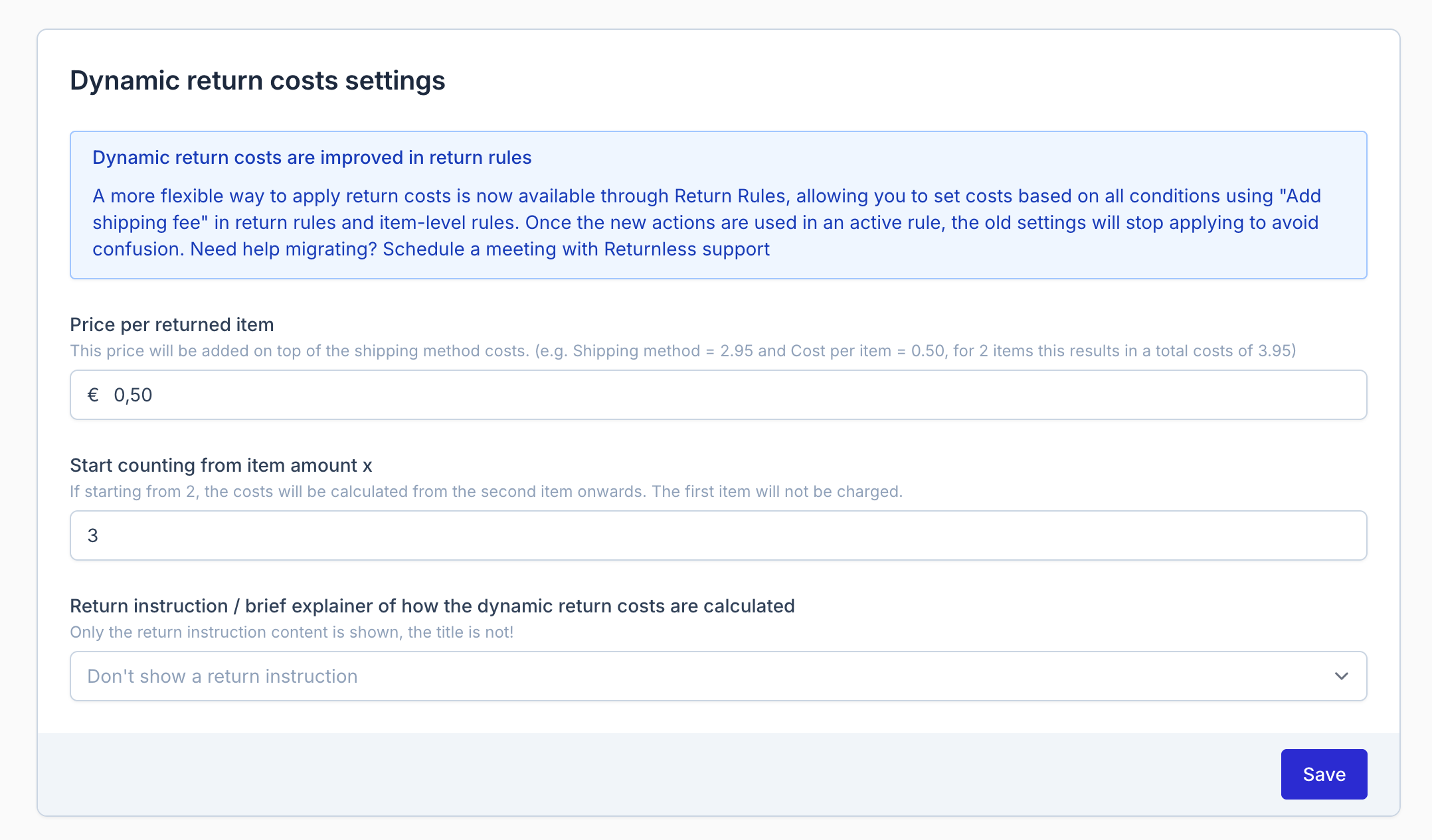 The Dynamic Return Costs Settings feature allows you to define the cost per returned item in addition to standard shipping costs. This enables flexible pricing based on the number of items returned, helping to manage return-related expenses effectively.