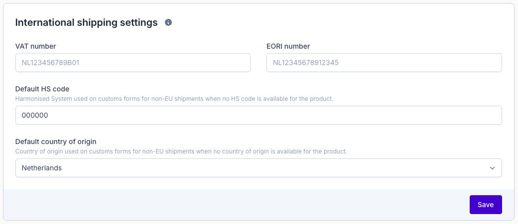 When you receive returns from outside the EU, additional customs documents are required. Returnless can automatically generate these documents, but we need some information to do so. In these settings, you can provide this information to ensure customs forms are correctly filled out.