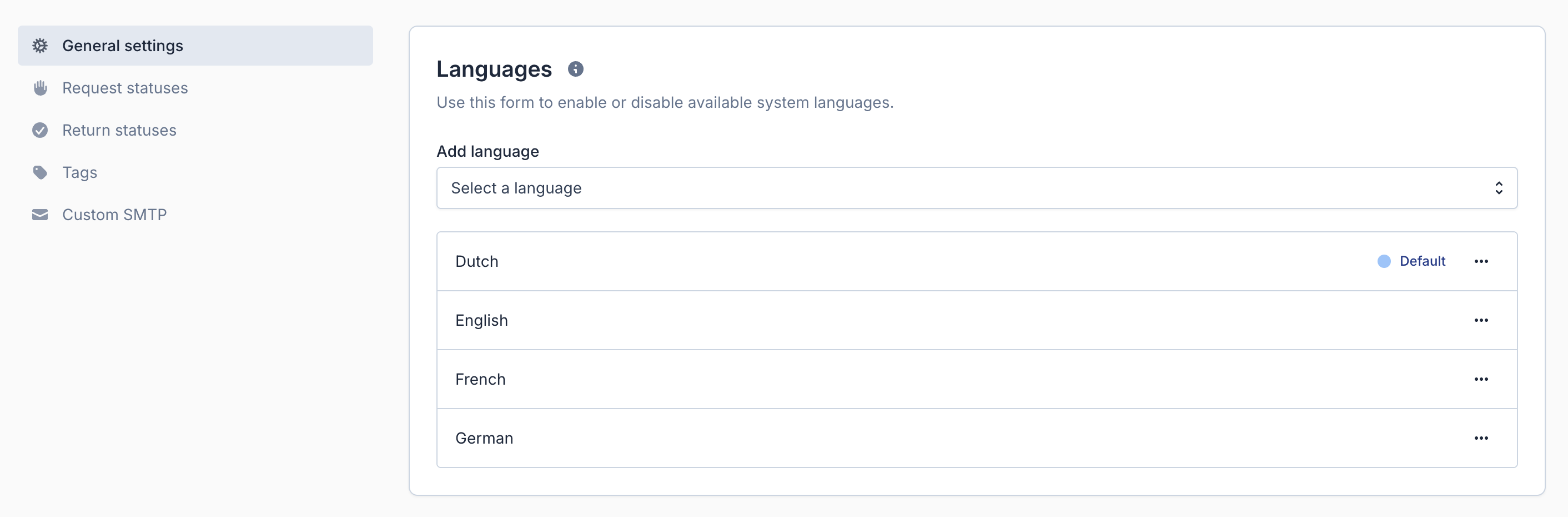 If a language is not yet visible in your return form, first ensure it is activated in the settings of the Return form. Only activated languages will appear in the Return panel, where you can add translations for all customer-facing text.