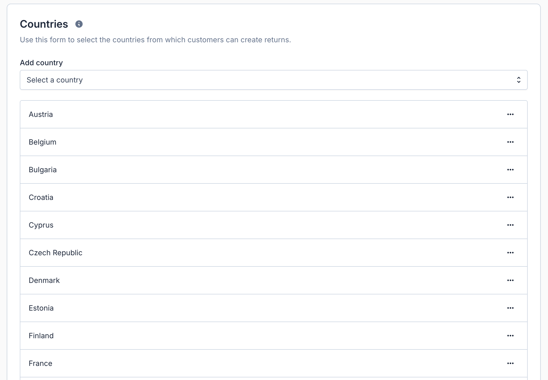 The countries you activate determine which options appear for consumers when submitting a return. Shipping methods are also dependent on the available countries—only countries enabled in this list can have shipping methods activated per return form.