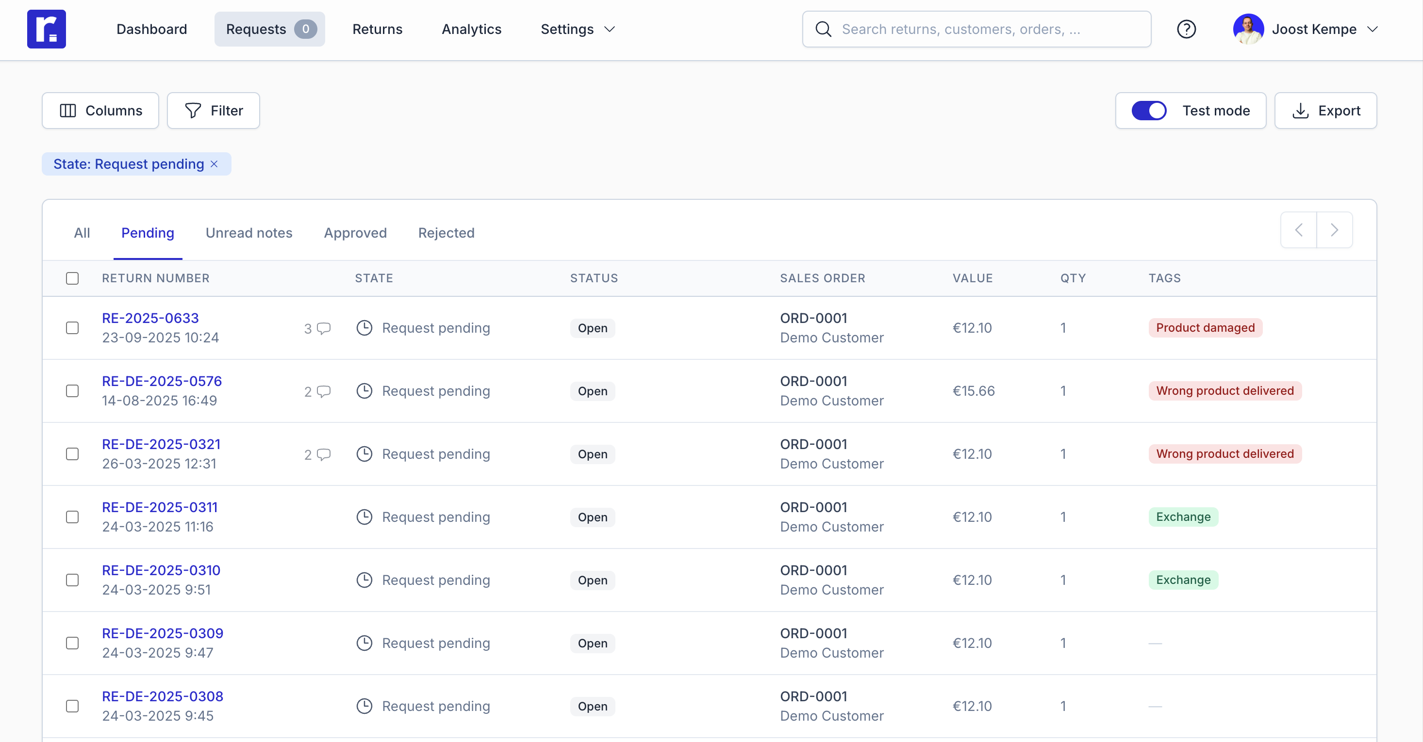 - Click a request’s return number to open it.