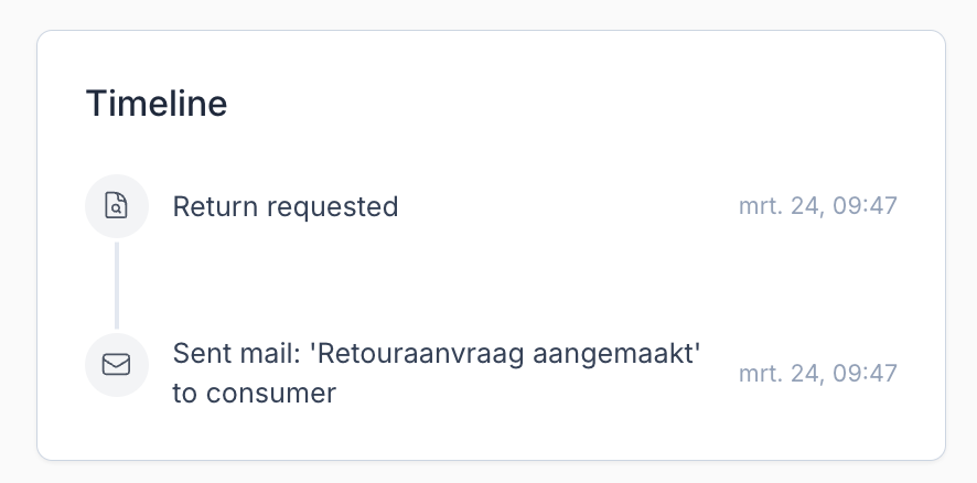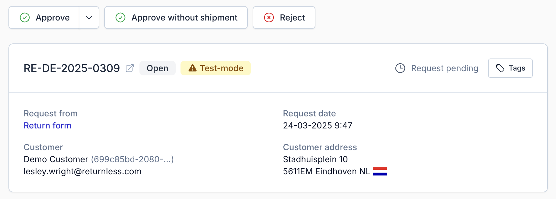 | Approve | Request approved. The customer can now create a shipment from the request status page. Once shipped, the request converts to a return. |