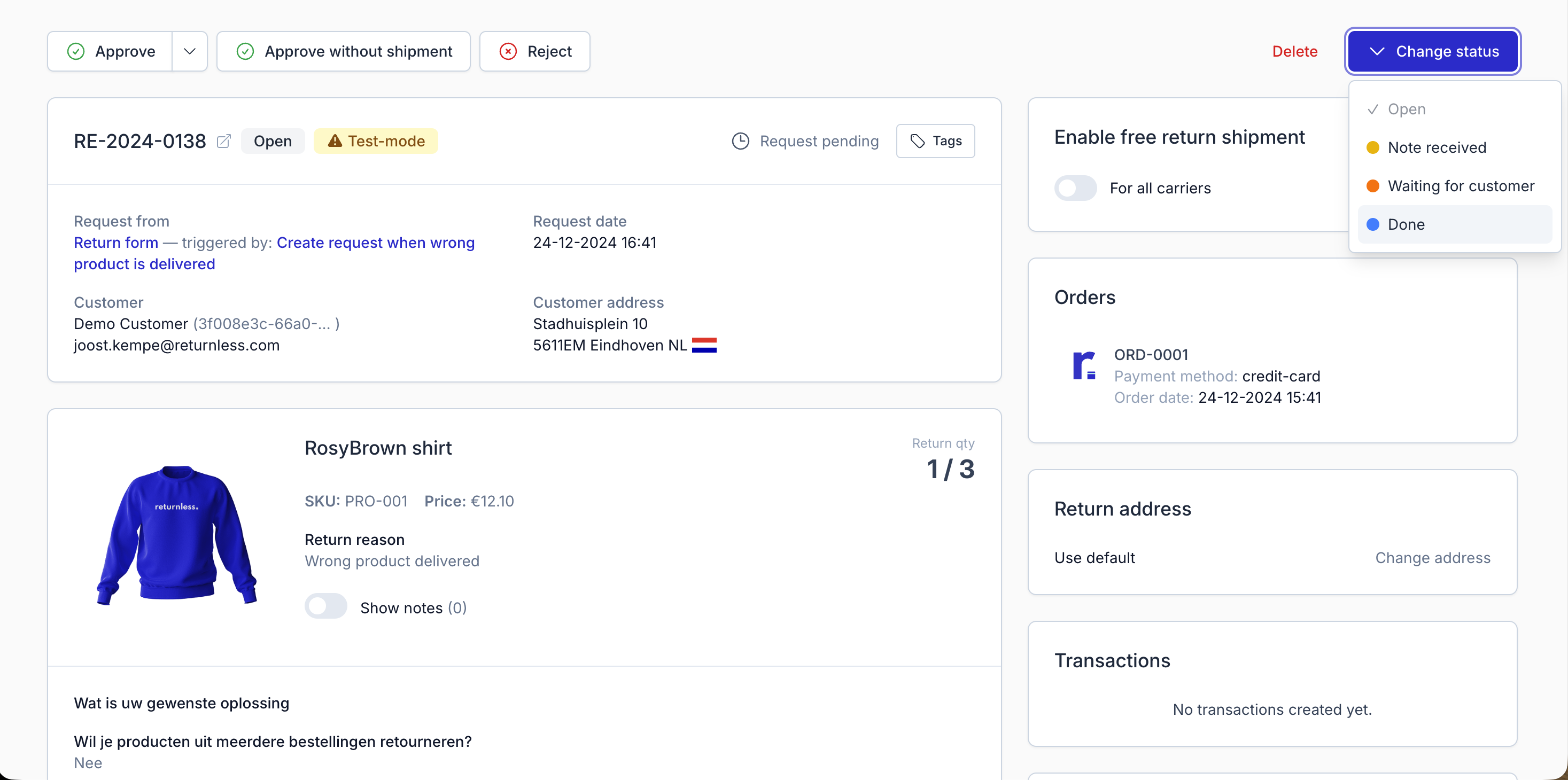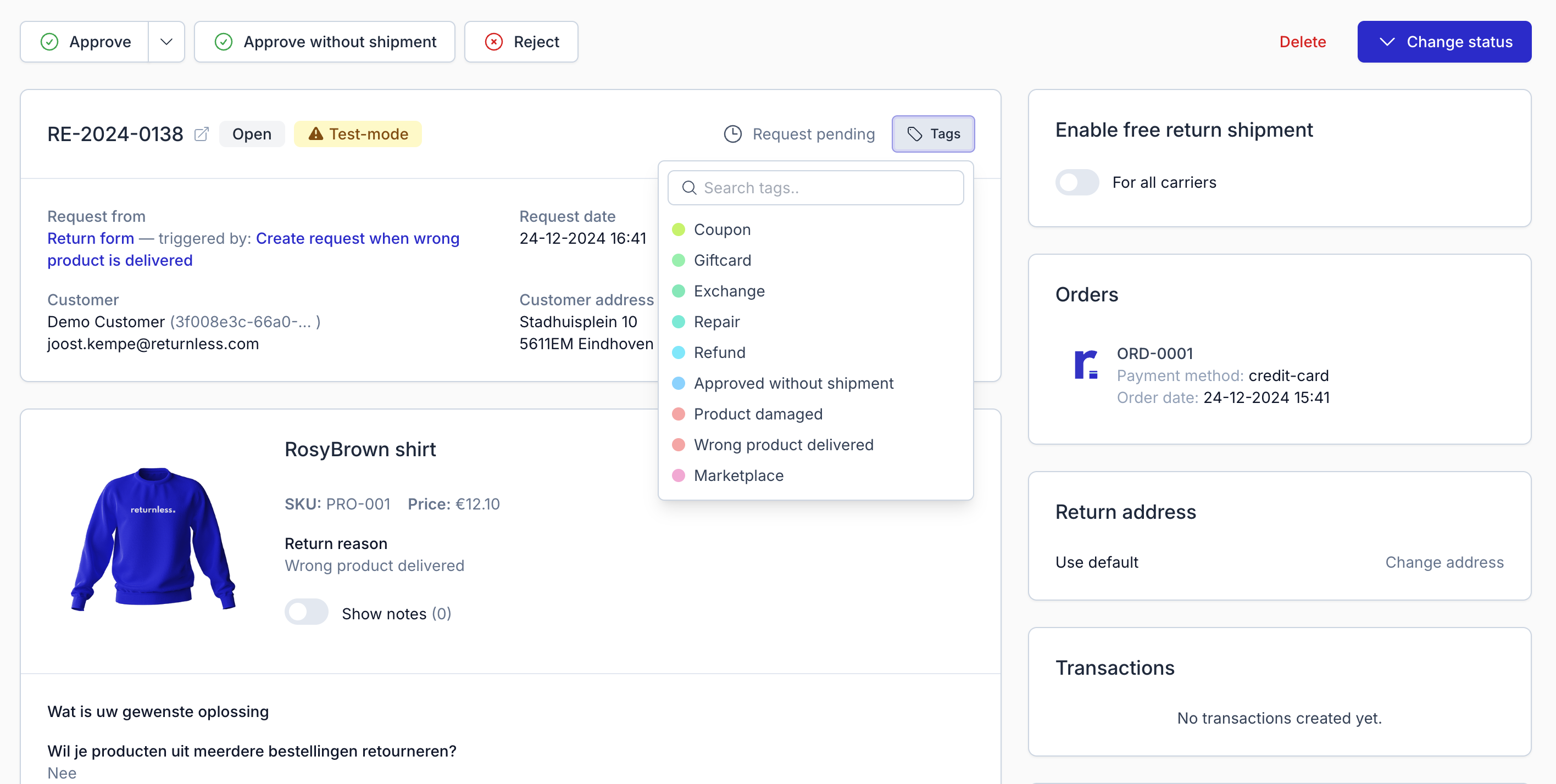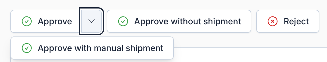| Approve with manual shipment | Approved with a manually created shipment. You choose the return address and shipment type, and optionally enter tracking details. |