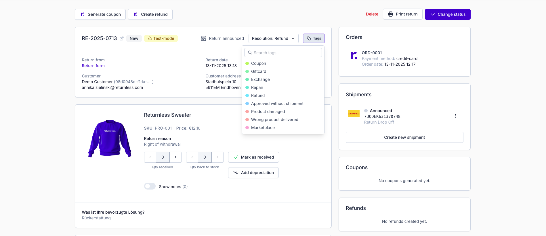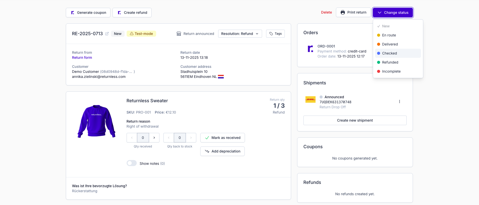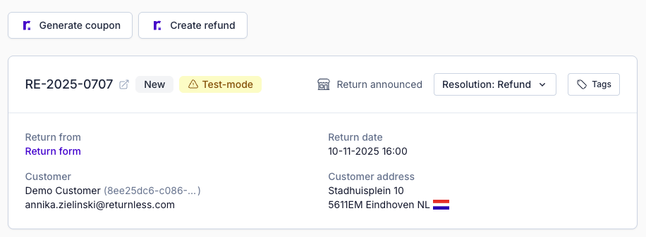 Return statuses are fully customizable and managed by the webshop owner. Your statuses should match the steps in your return workflow. To change a return's status:
