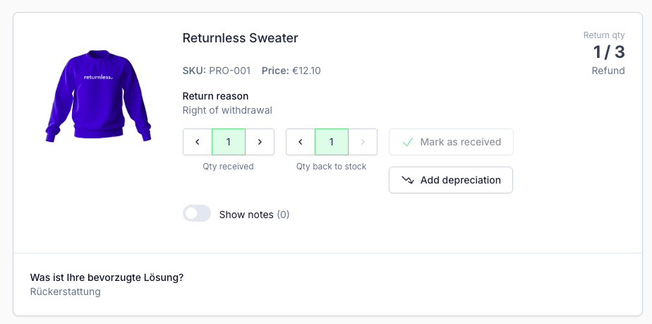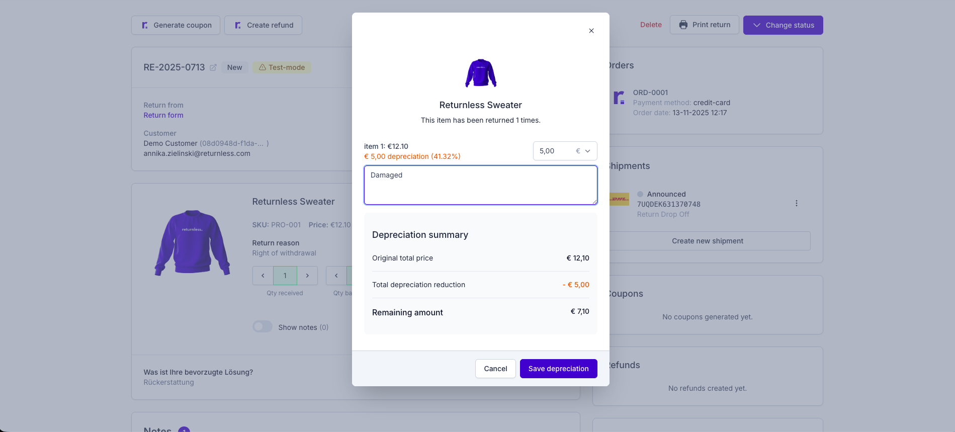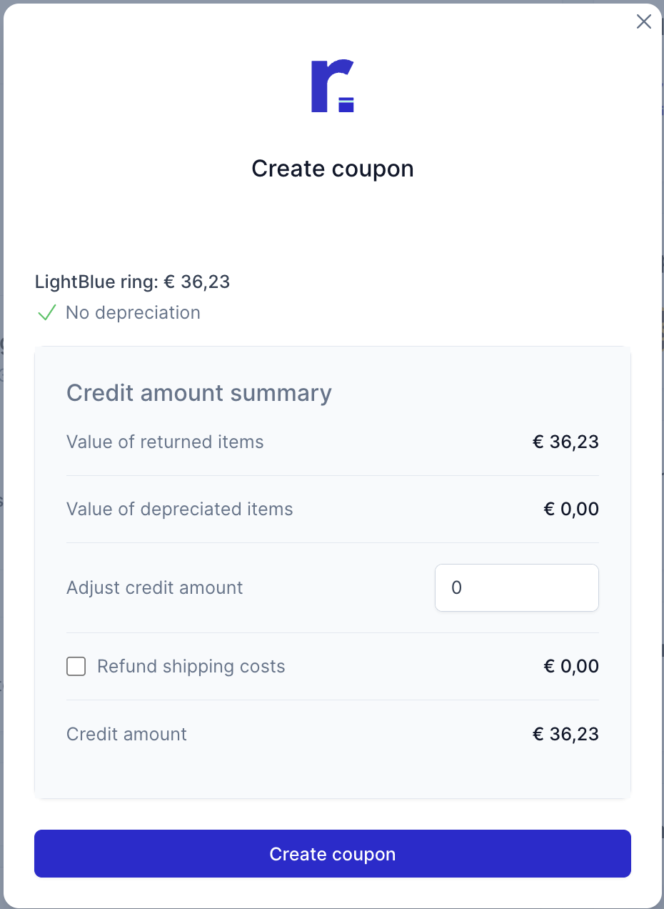 If an item is returned damaged, you can apply depreciation. Example: A slightly damaged item may receive 10% depreciation, reducing the refund or coupon value accordingly.