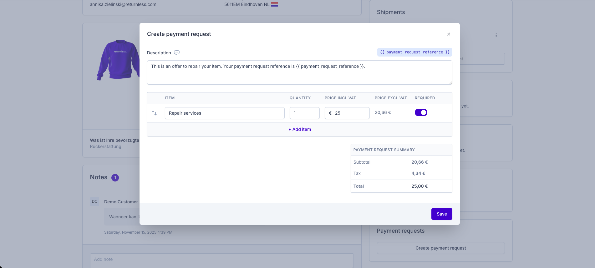 Your customer receives an email with payment instructions. Once paid, the request is shown as Paid within the return.