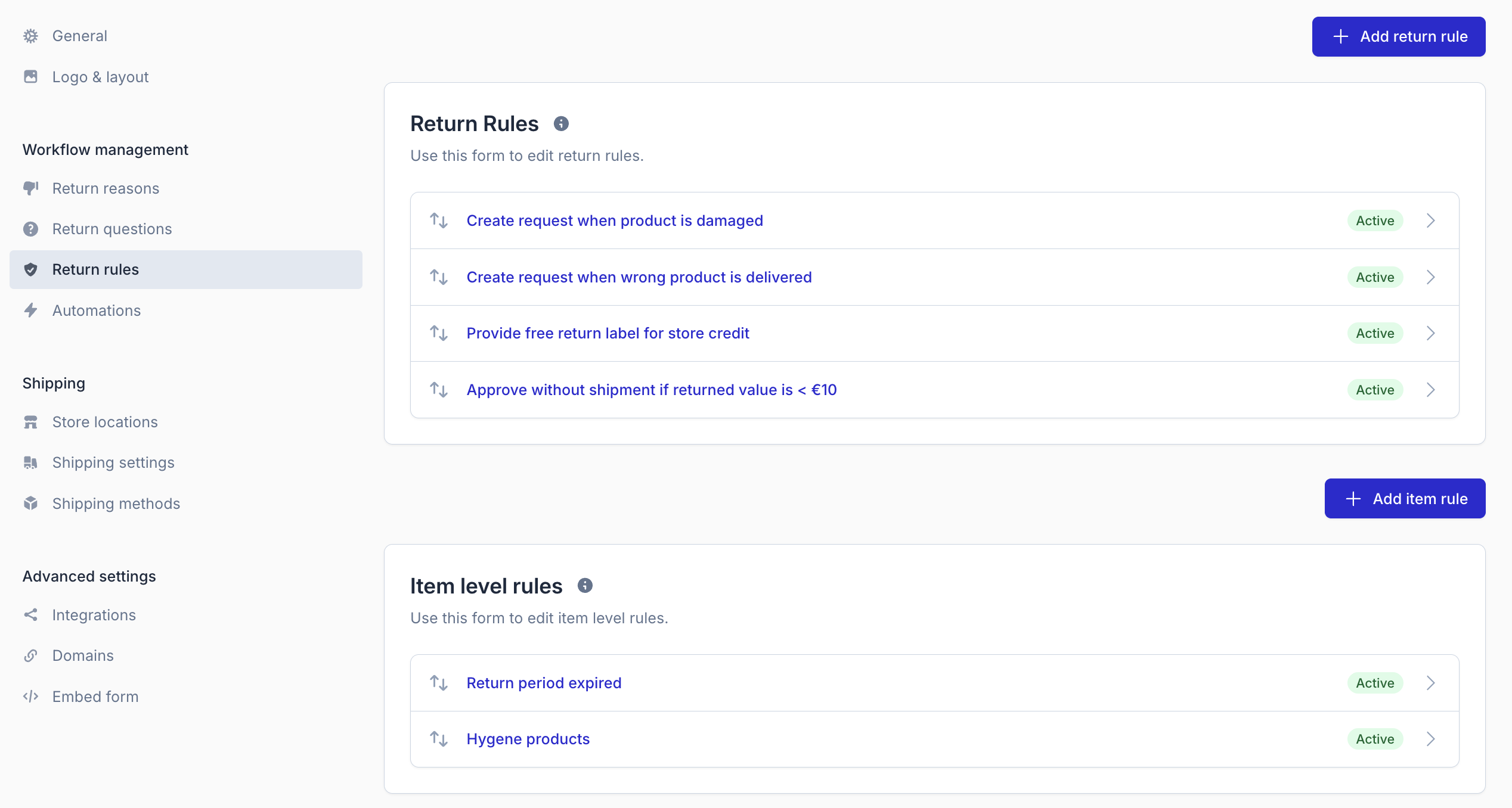 - Return rules are applied in a priority order, from top to bottom. To change the priority use the arrows on the left of each return rule to drag and drop them in the desired order..