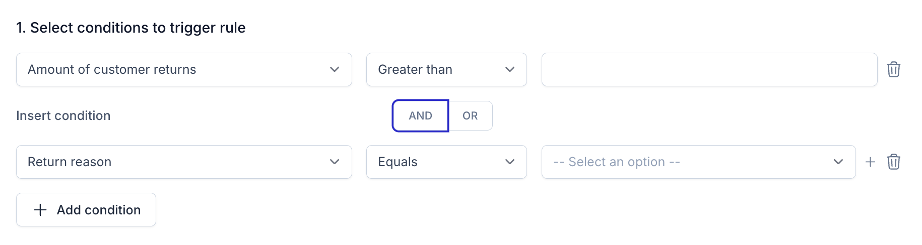 | Quantity returned | Number | Number of items selected for return is lower/equal/higher than the set number. |