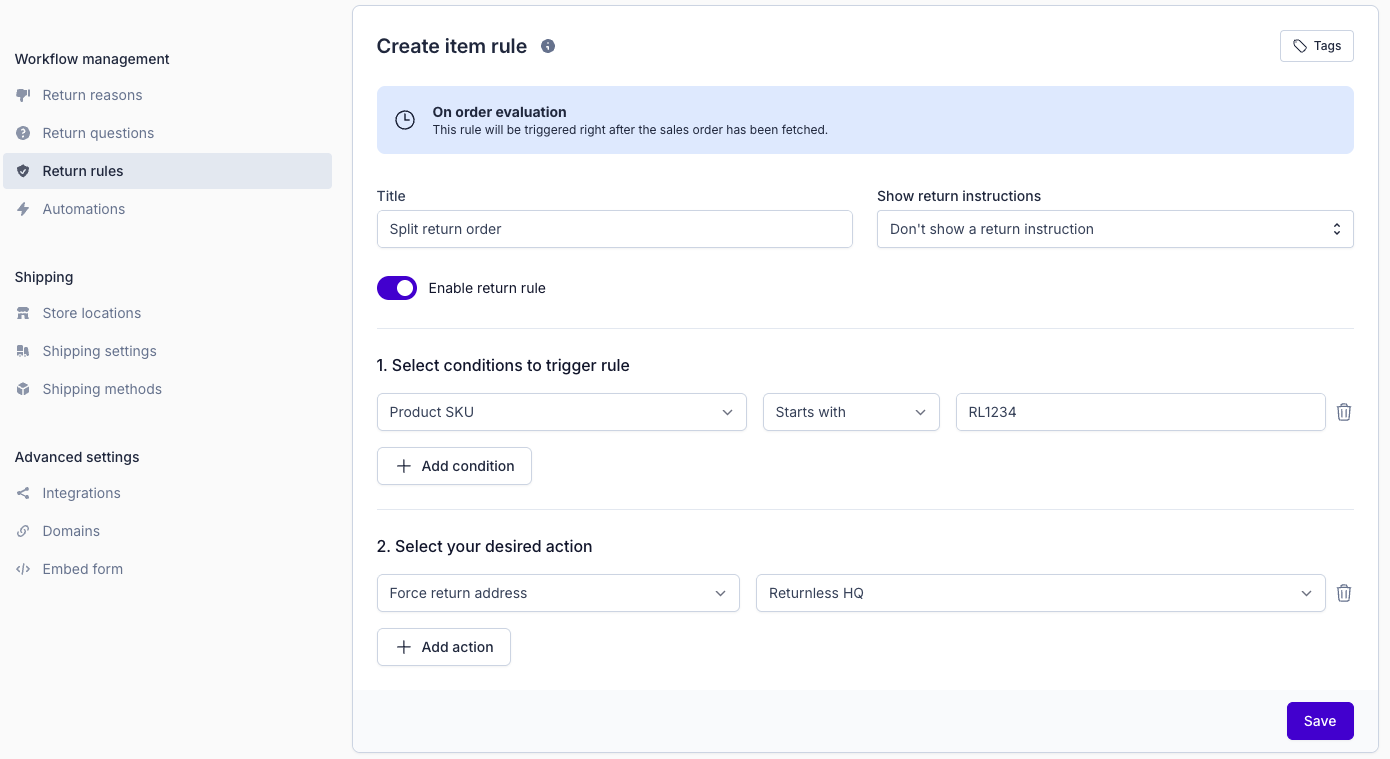 This ensures that any item matching the rule’s conditions is always shipped to the specified return address.