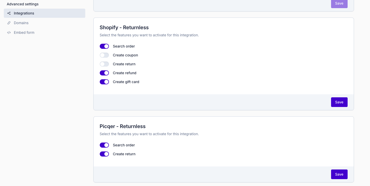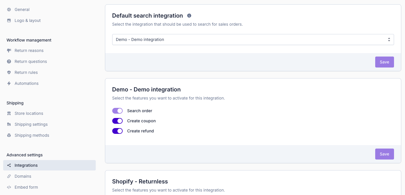 When a customer searches for their order in a return form, Returnless looks for matching orders across all connected integrations. In the Integrations panel of a return form, you can control which integrations are used and how they contribute to the return flow.