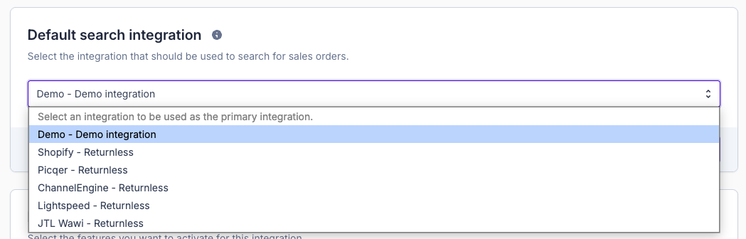 At the top of the Integrations panel, select your preferred order search integration from the dropdown list (this is the integration used for the order lookup step by your customers). All available integrations in your account will appear in this list.