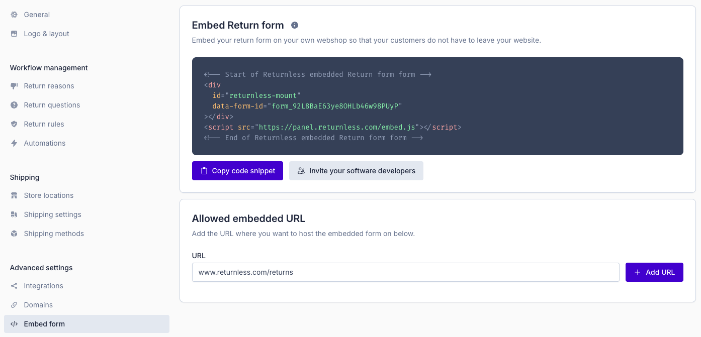 Embedding a Returnless return form directly into your website allows your customers to complete their return announcement without being redirected away from your shop. This creates a smoother experience and helps maintain trust and consistency throughout the return process.