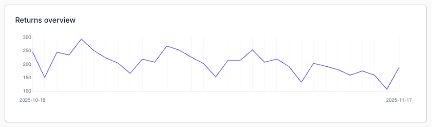 The Analytics Overview gives you insight into your returns and shipments over time. From here, you can analyze volumes, reasons, and trends using filters and date ranges.