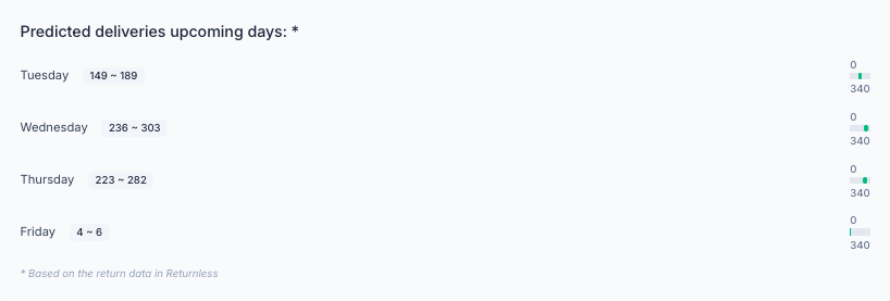 This section displays projected incoming shipments for the upcoming days, shown as a min–max range.