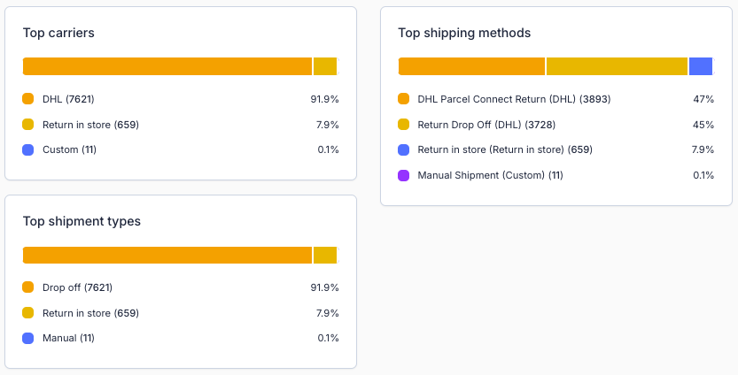 The Shipping Analytics page provides insight into shipment statuses, carrier performance, transit times, costs, and routes. It helps you understand how your return shipments move through the logistics chain and where improvements can be made.